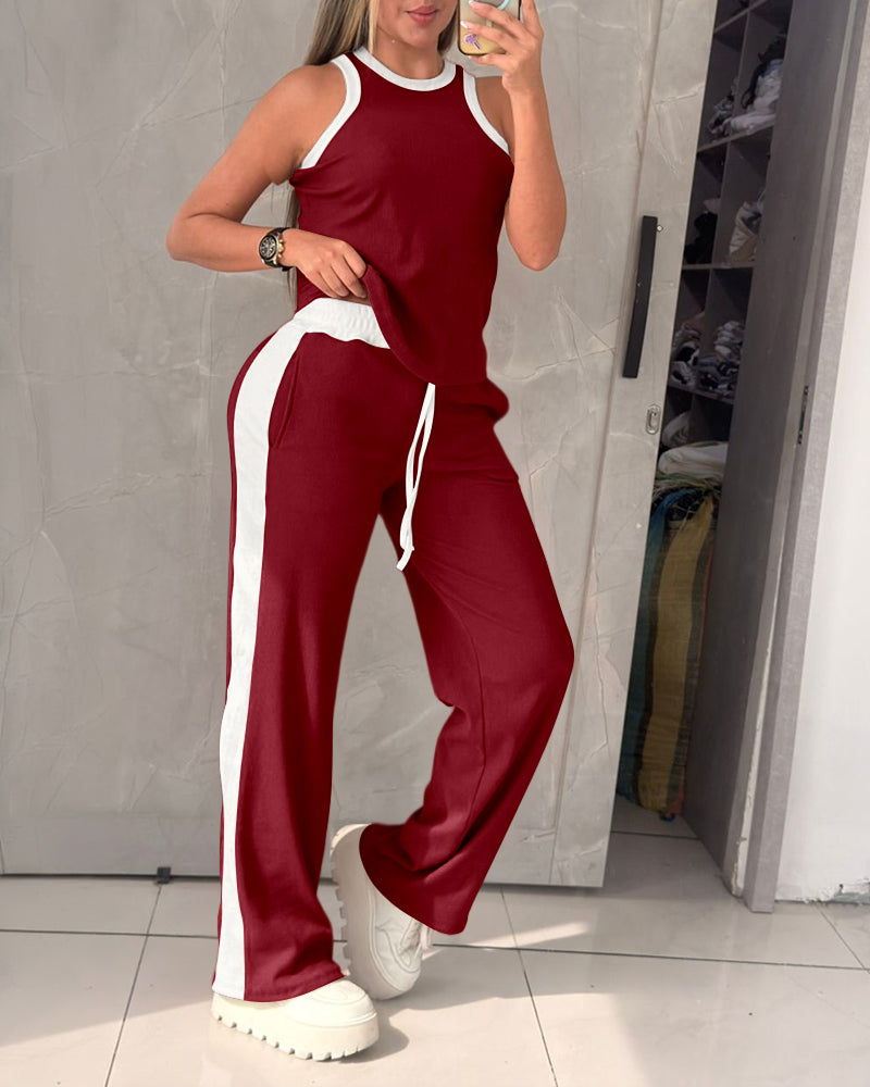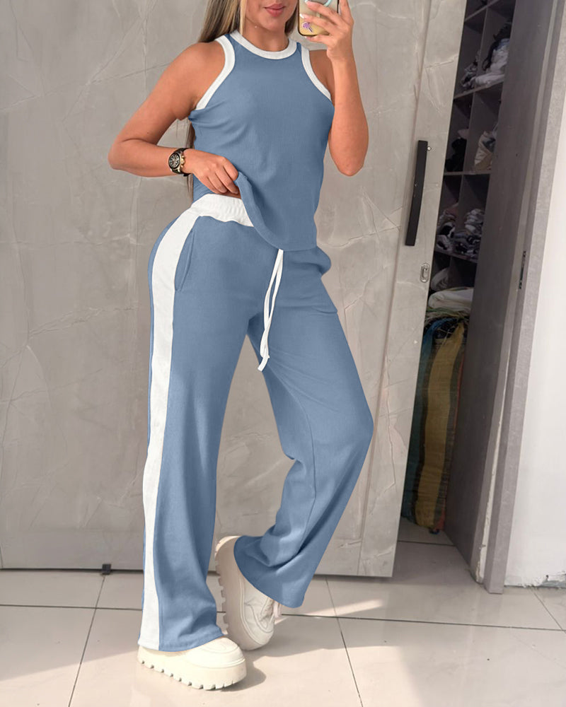 Women's Contrast Binding Knit Set Halter Tank Top and Wide Leg Pants 2 Piece Tracksuit Ribbed Loungewear