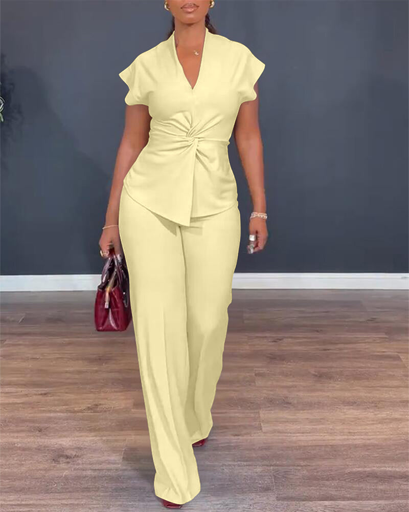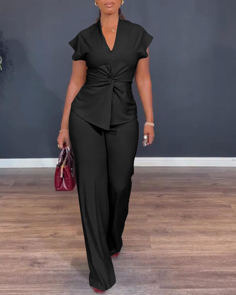 2 Pieces Outfit V-Neck Short Sleeve Twist Front Zipper Back Top and Straight Leg Pants Set Casual Commuting Set
