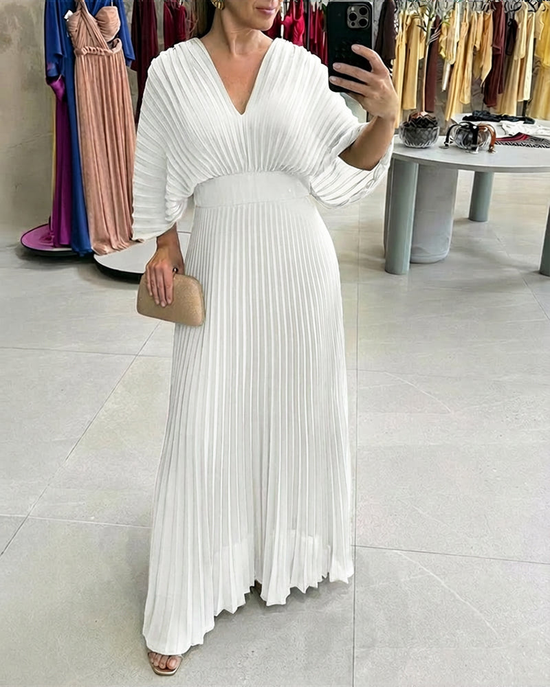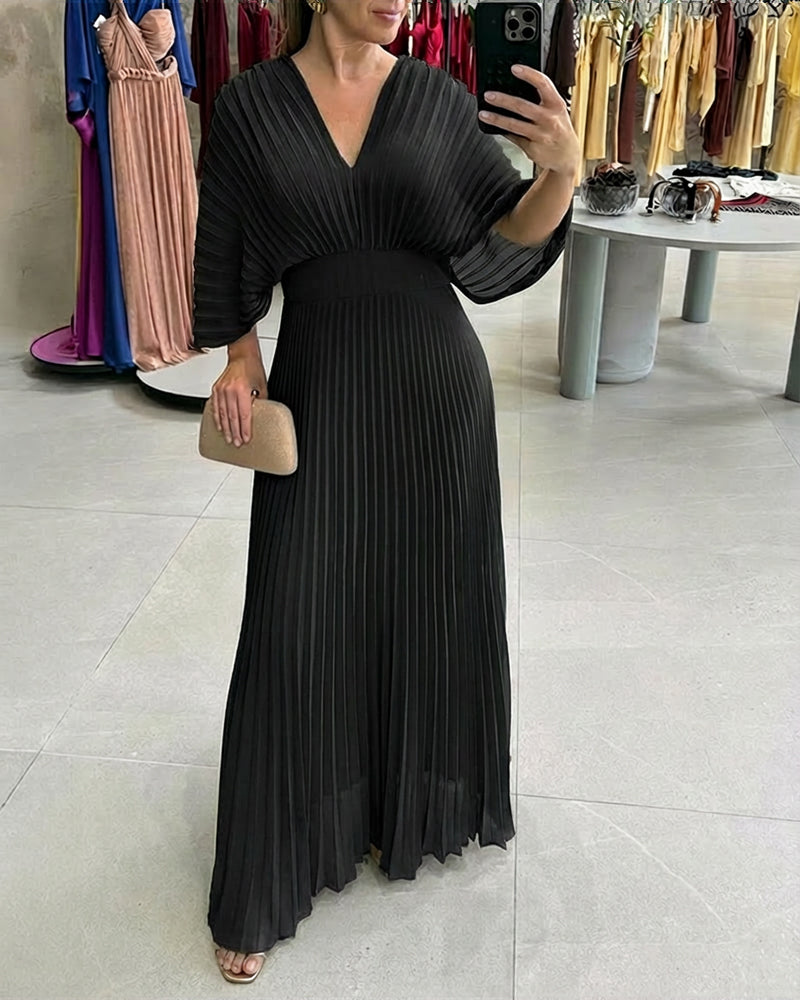 Deep V-Neck Batwing Sleeve High Waist Pleated Maxi Dress Casual Cinched Waist Backless Tied Detail Zipper Back Evening Dress