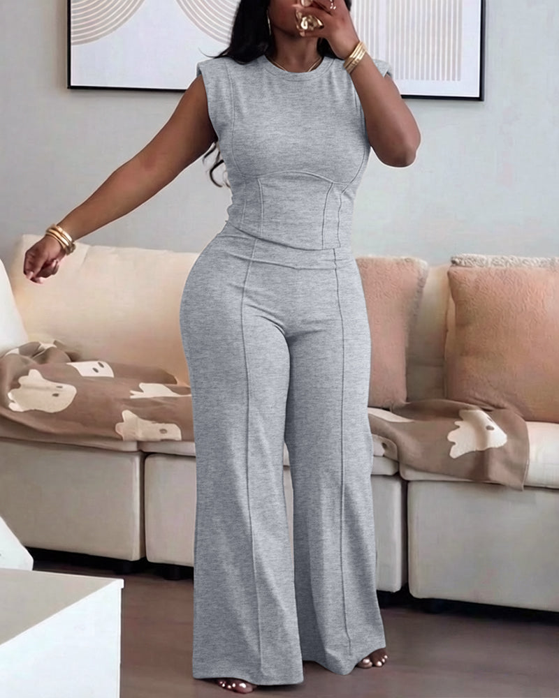2 Pieces Outfit O-neck Sleeveless Padded Shoulders Cinched Waist Crop Top and Elastic Waist Seam Front Wide Leg Pants Set