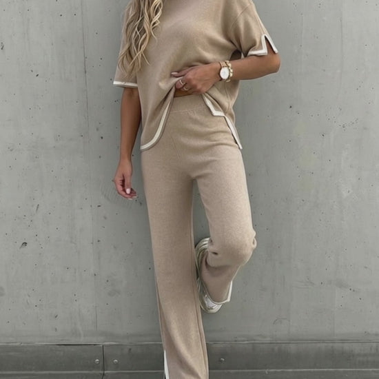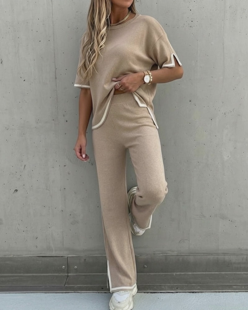2 Pieces Outfit Round Neck Short Sleeve High-Low Hem Top and Elastic Waist Straight Leg Pants Set Casual Contrast Paneled Side Slit Knit Loungewear Set