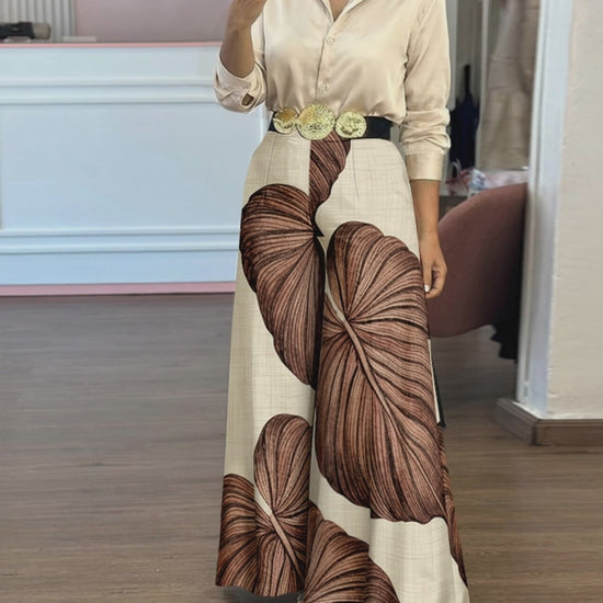 2 Pieces Outfit Turn-down Collar Long Sleeve Button Front Satin Shirt and Vintage Leaves Print Elastic Back Waist Wide Leg Pants Set