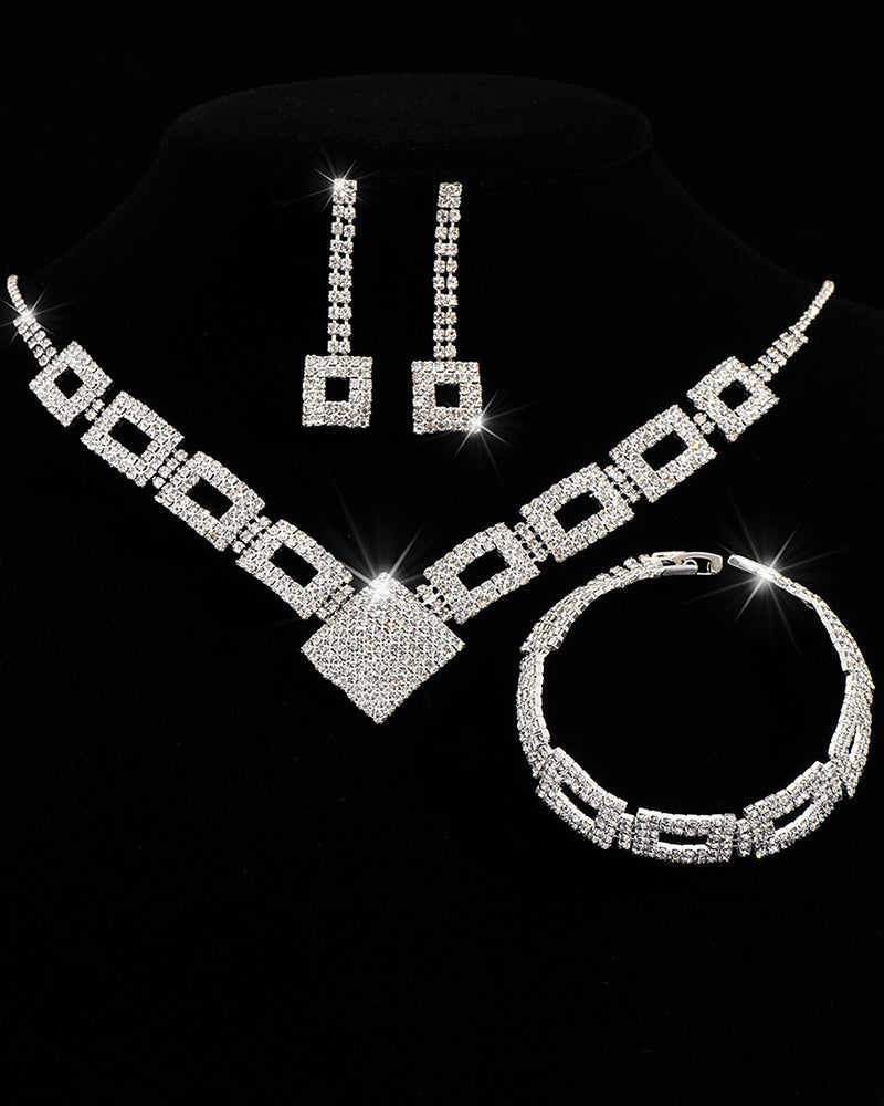 3PCS Allover Rhinestone Hollow Out Square Pendant Necklace & Drop Earrings & Bracelet Evening Party Wedding Jewelry Set