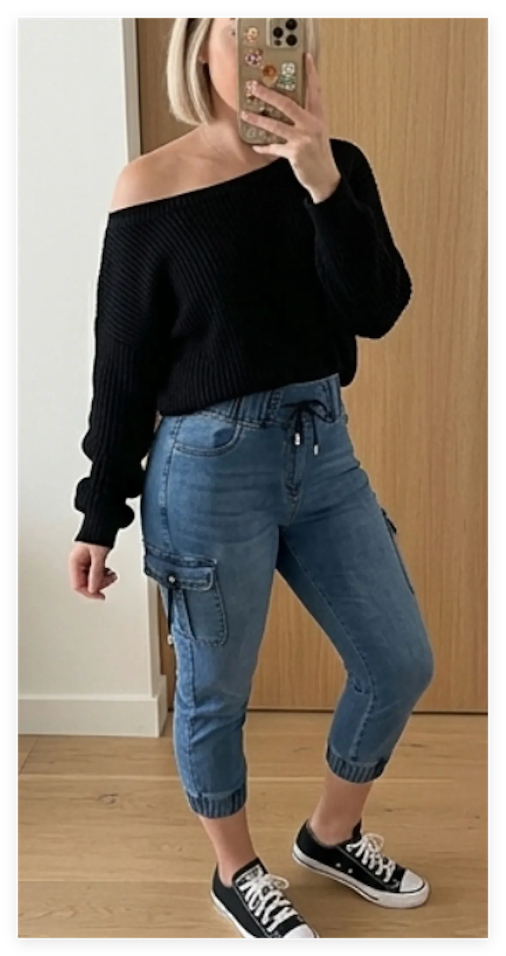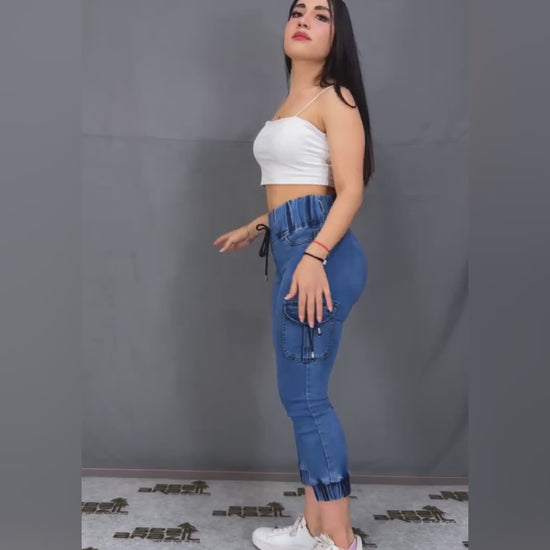 Design Details: Features a high waist with an adjustable drawstring and elastic waistband for flexible fit. Functional side pockets add practicality, making the jeans easy to wear for casual, on-the-go styling.