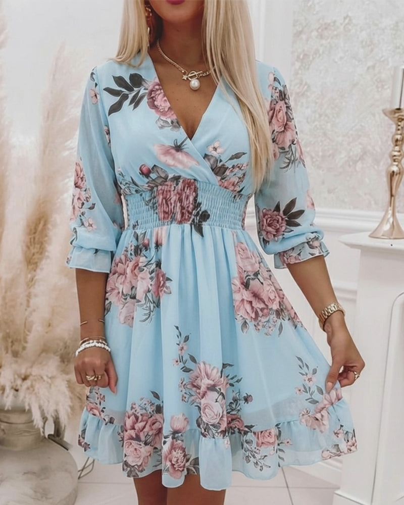 Floral Print Overlap V Neck Three Quarters Sleeve Shirred Waist Ruffle Hem Dress Casual Cinched Waist Flared Cuffs Chiffon Vacation Dress with Lining