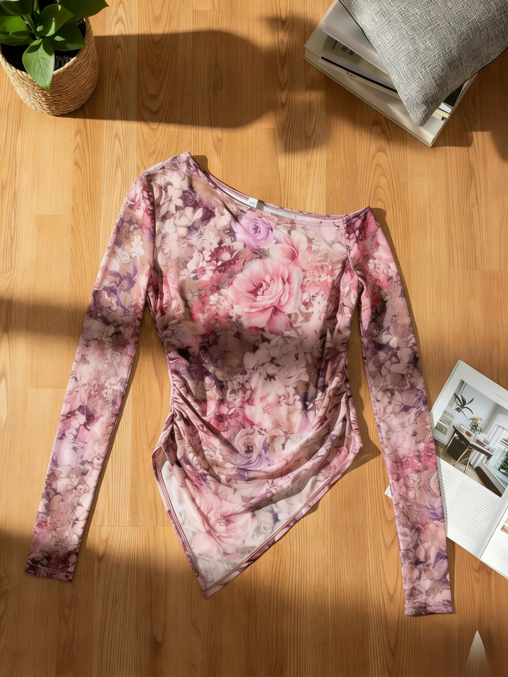 Floral Print Skew Neck Long Sleeve Asymmetrical Hem Tee Slim Fit Side Ruched Sheer Mesh Top with Thumb Hole Cuffs & Lining