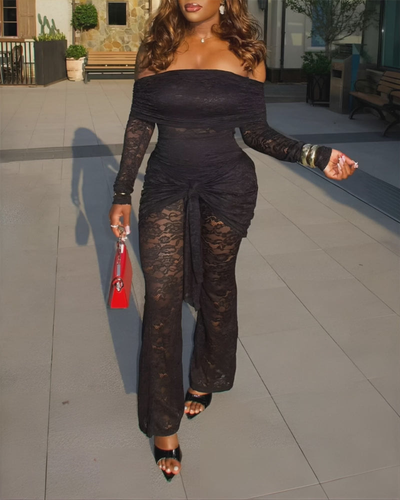Foldover Off Shoulder Long Sleeve Tied Detail Lace Overalls Sexy Ruched Flared Jumpsuit