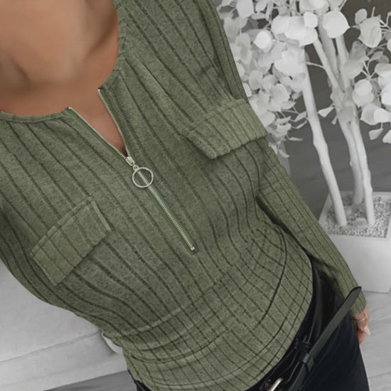 Design Details: The half-zip neckline with a metal ring pull allows adjustable styling — zip it up for a neat, modest look or unzip slightly for a more relaxed edge. Two decorative flap accents on the chest add dimension and sophistication, while the ribbed texture introduces subtle structure to the design.