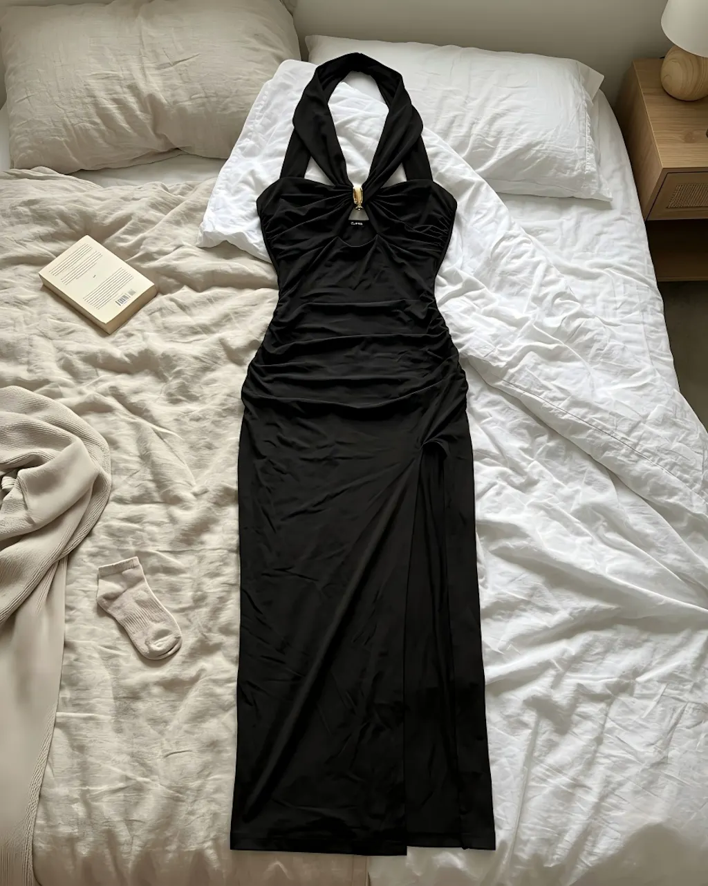 DESIGN - Criss-Cross & Gold Detail: Features eye-catching, wide criss-cross straps adorned with luxurious gold-tone buckle hardware, creating a striking focal point at the neckline. The high side slit adds a touch of alluring drama while ensuring freedom of movement, perfectly balancing the bold design with practical functionality.