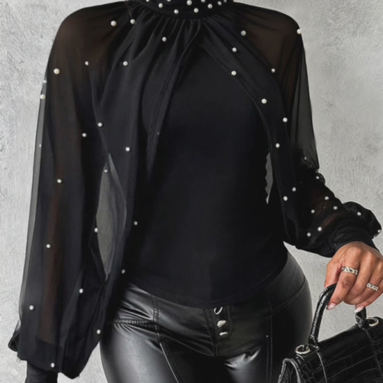 Design Details: Features a high neck with ruched detailing and pearl embellishments on both the collar and draped shoulder overlay. The back has a subtle hollow-out for a delicate, playful touch, adding dimension to the otherwise sleek silhouette.