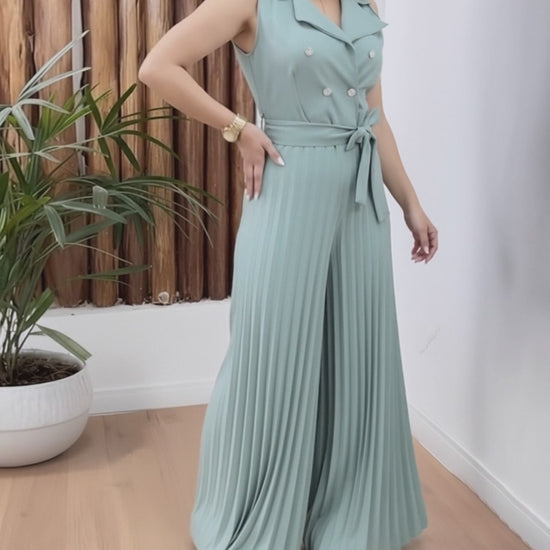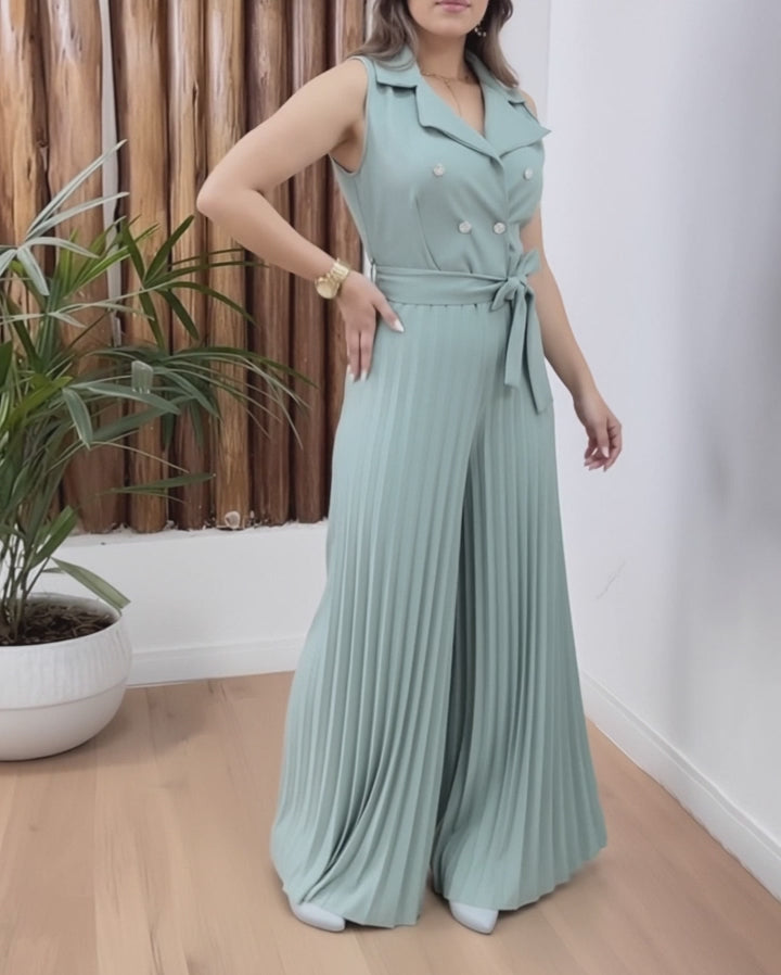 Sleek Sleeveless Notched Collar Waist Tied Detail Jumpsuit Casual Wide Leg Pleated Romper