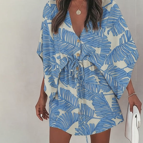 Tropical Plants Print V-Neck Bell Sleeve Button Front Mini Dress Casual Drawstring Waist Vacation Dress