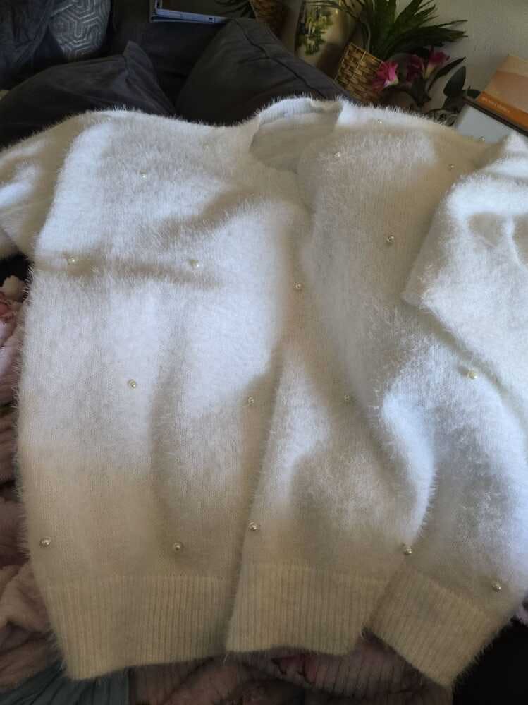 V Neck Long Sleeve Beaded Decor Oversized Sweater Fluffy Pullover Top