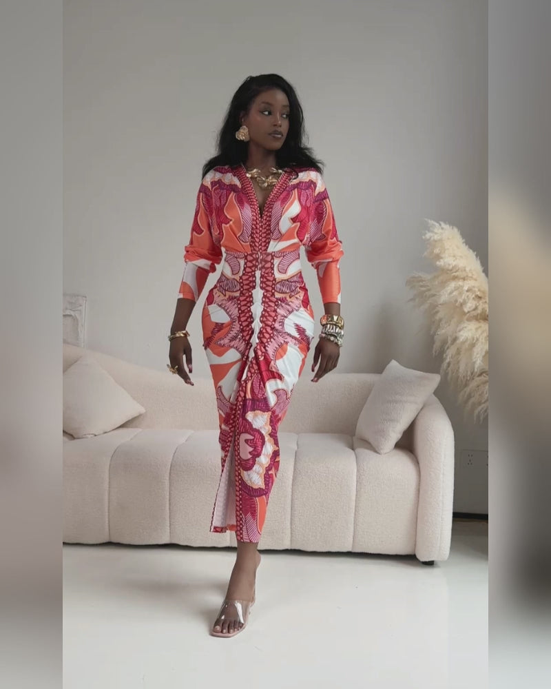 Design Details: Features a vintage baroque print, plunging deep V-neckline, long sleeves, ruched waist detail, and a daring front slit for chic elegance.