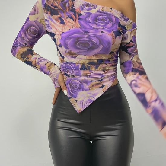 Vintage Floral Print Skew Neck Long Sleeve Asymmetrical Hem Tee Slim Fit Side Ruched Sheer Mesh Top with Thumb Hole Cuffs & Lining