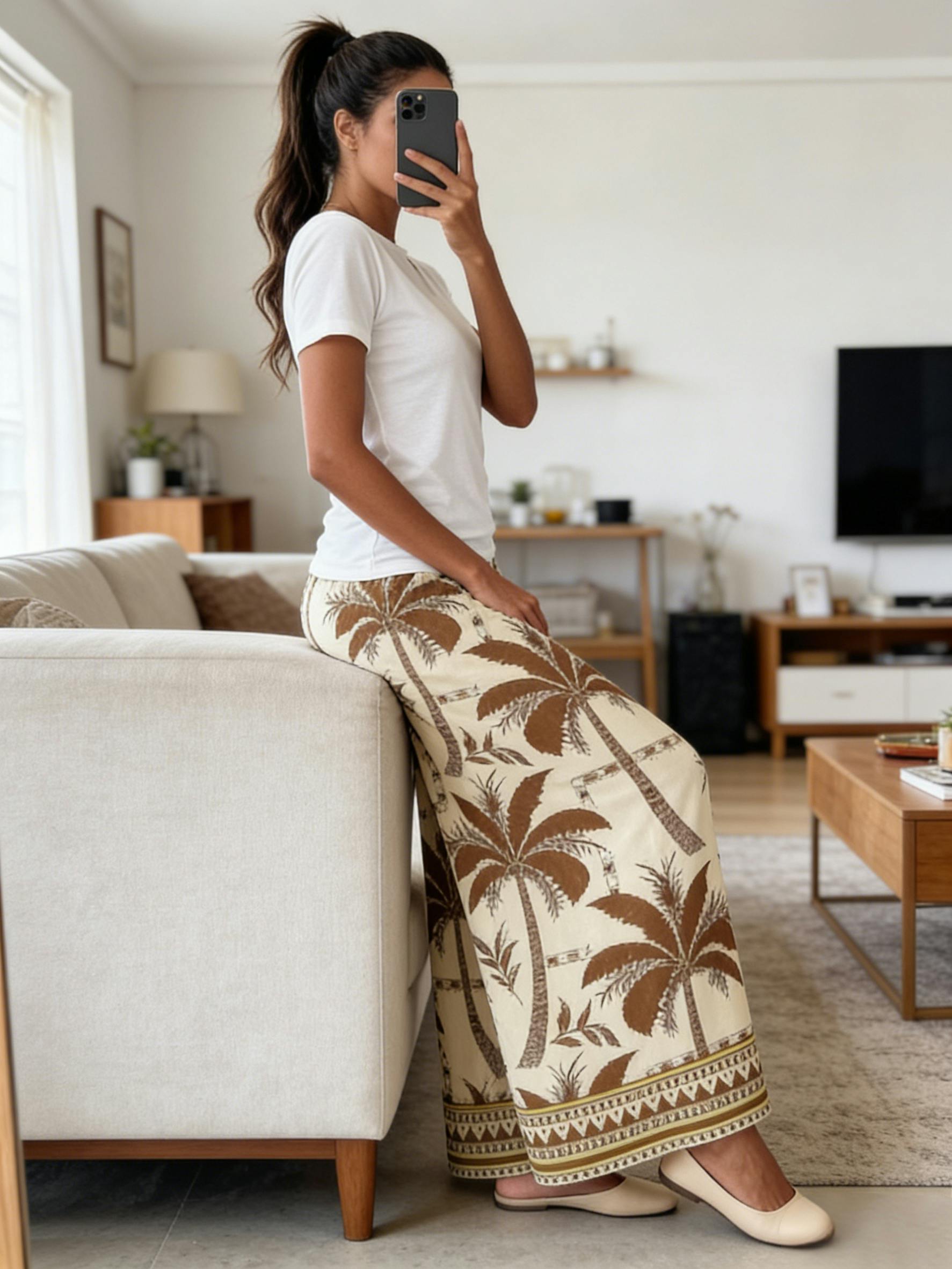 Design Details: Features vintage-inspired tropical plant prints and ethnic-style hem details. The shirred elastic waist ensures a secure yet comfortable fit while enhancing the overall drape of the pants.