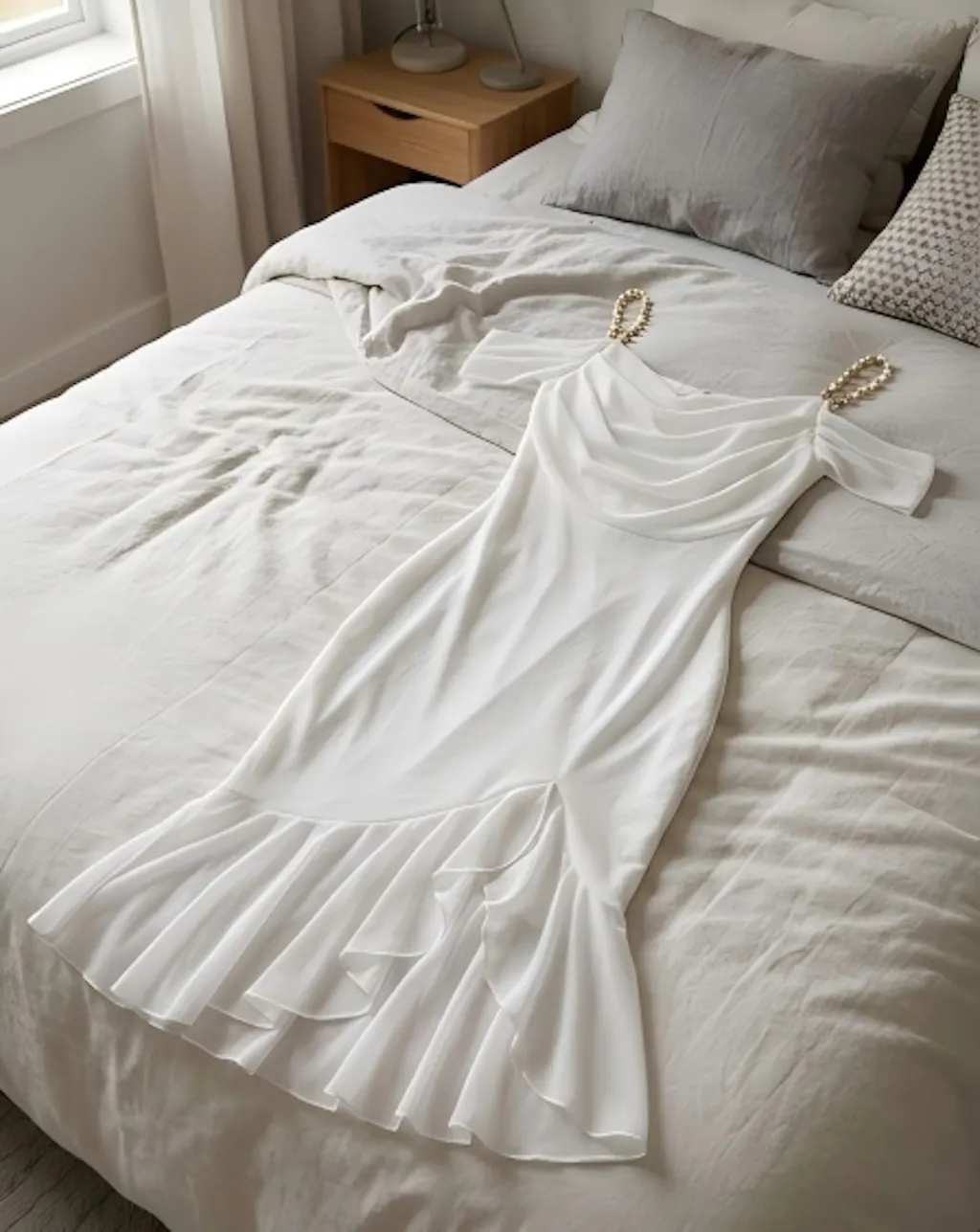 Design Details: Features off-shoulder styling with elastic pearl straps and a draped neckline for a refined look. Ruched detailing enhances the waistline, while the asymmetrical ruffle hem adds movement and layered visual interest.