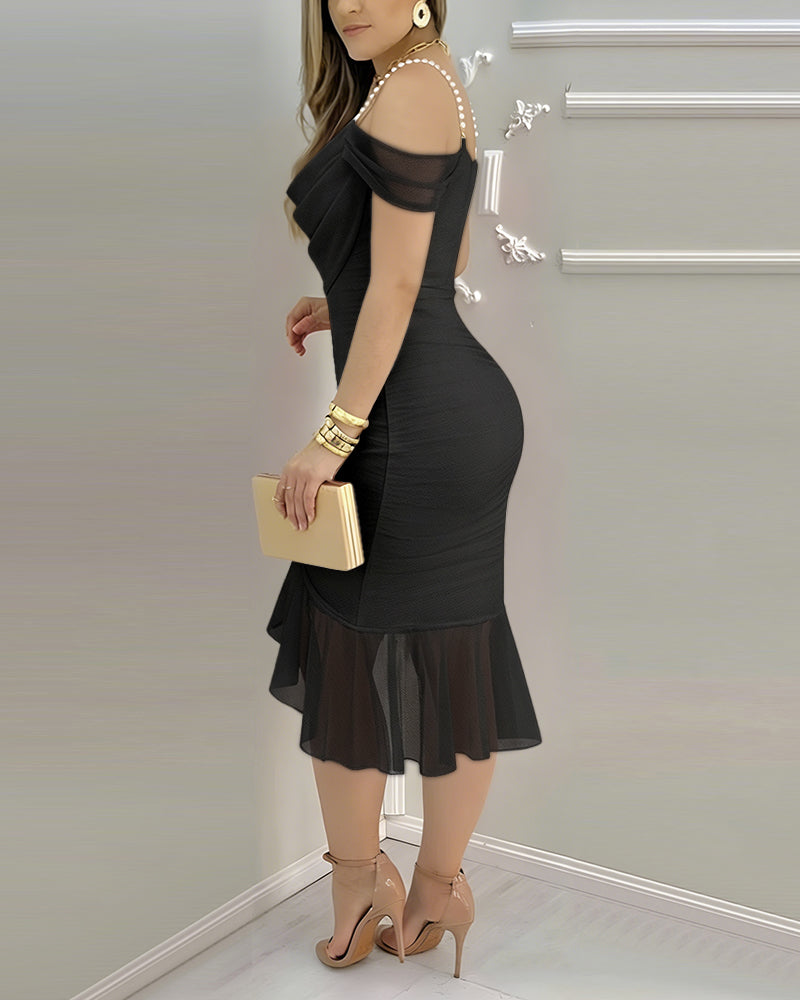 Women's Off Shoulder Mesh Dress Pearl Strap Ruched Bodycon Dress Ruffle Hem Slit Evening Party Dress
