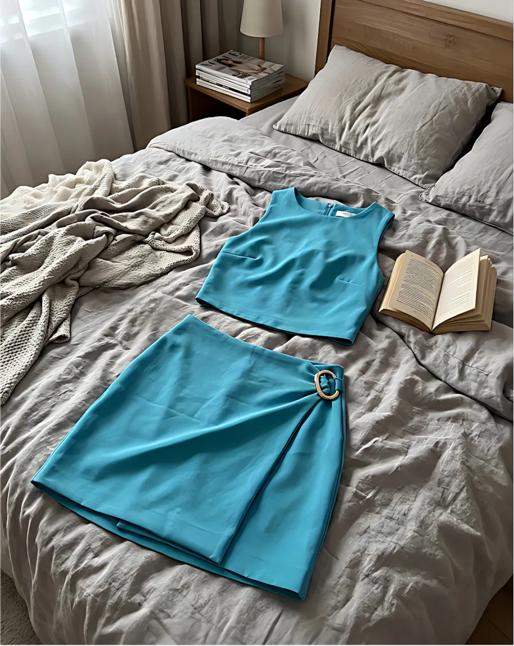 DESIGN - Side Cutout & Gold Buckle: Elevated by sophisticated side cutouts and a polished golden ring buckle. The classic crew neckline is complemented by a back keyhole with button closure on the sleeveless top for easy wear, while a hidden side zipper and elastic back waistband add a modern, architectural edge to this set.