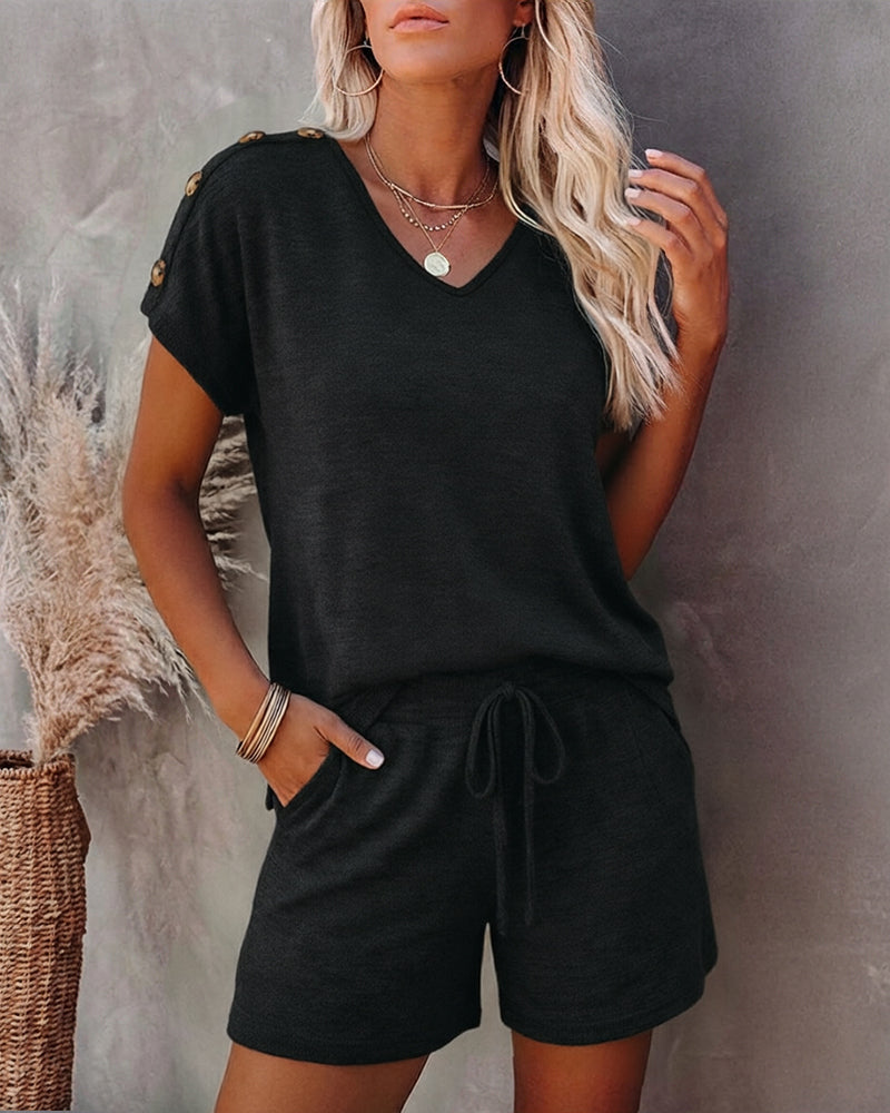 Women's V Neck Short Sleeve Top and Drawstring Shorts Set Casual Loose Fit Loungewear Two Piece Outfit with Pockets