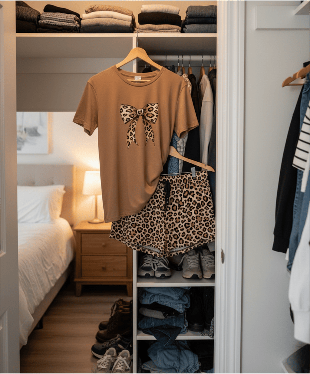 Design Details: Top showcases a leopard print with bowknot accents, while shorts feature an all-over leopard print for coordinated style. Shorts include practical side pockets for convenience.