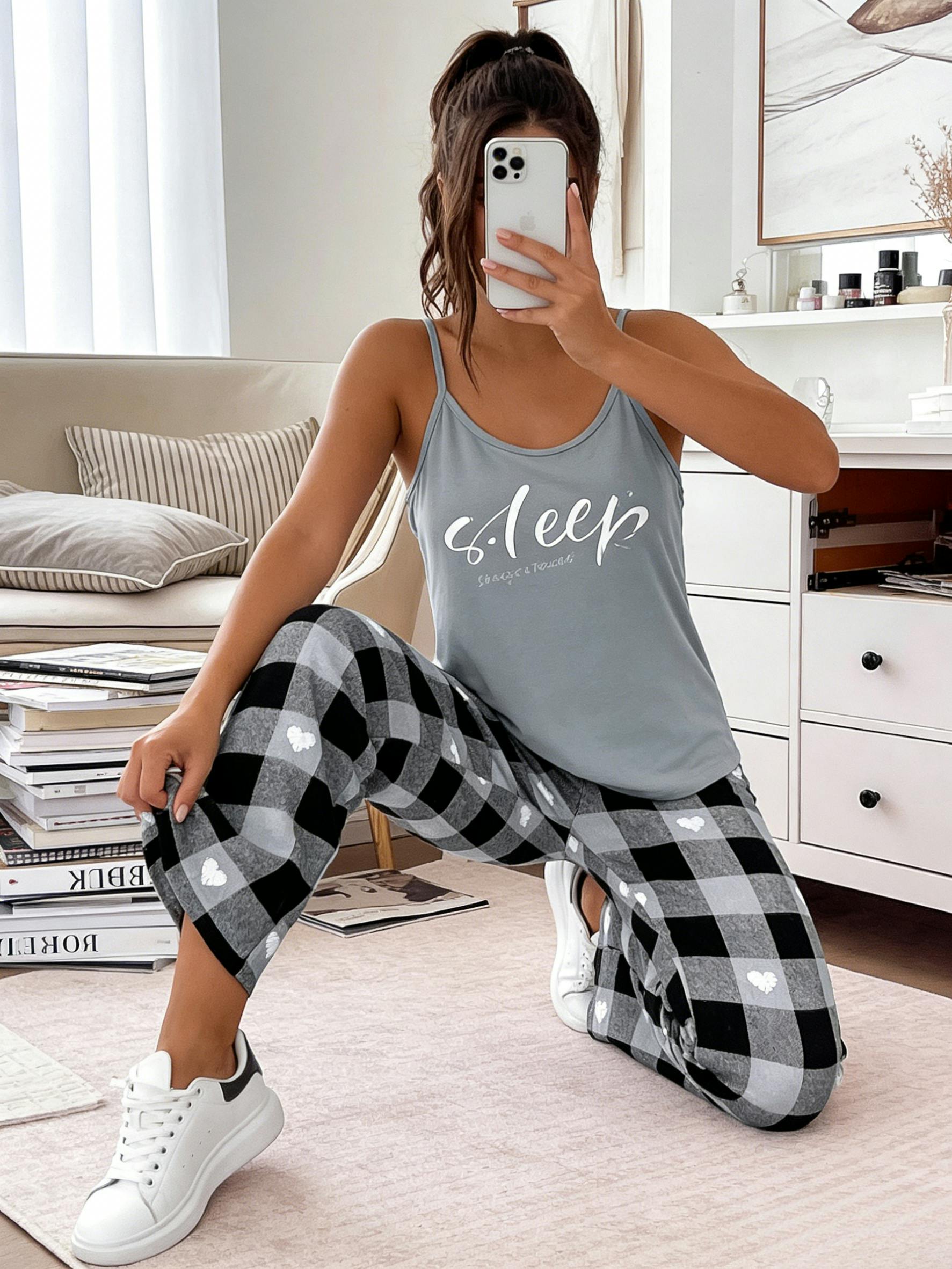 Design Details: The cami is printed with “sleep” letter and eyelash motifs for a soft, sweet mood. Contrast plaid wide leg pants feature subtle heart accents, finished with a stretchy waist and functional side pockets for practicality.