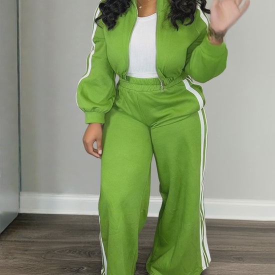2 Pieces Outfit Stand Collar Zip Up Stretchy Hem Crop Coat and Elastic Waist Wide Leg Pants Set Casual Contrast Side Striped Set