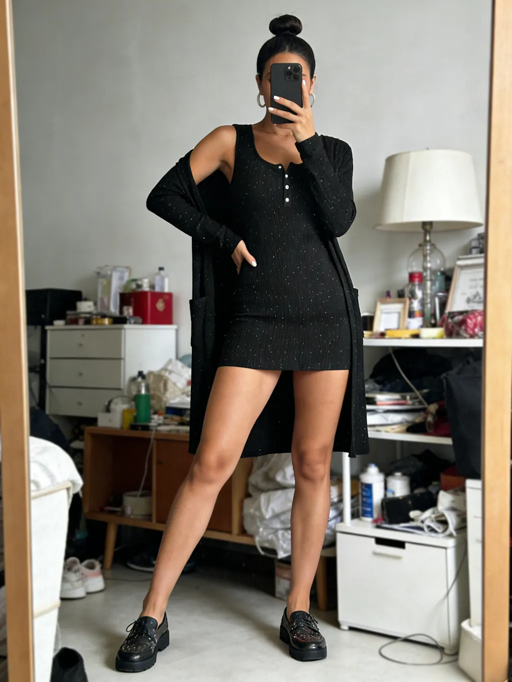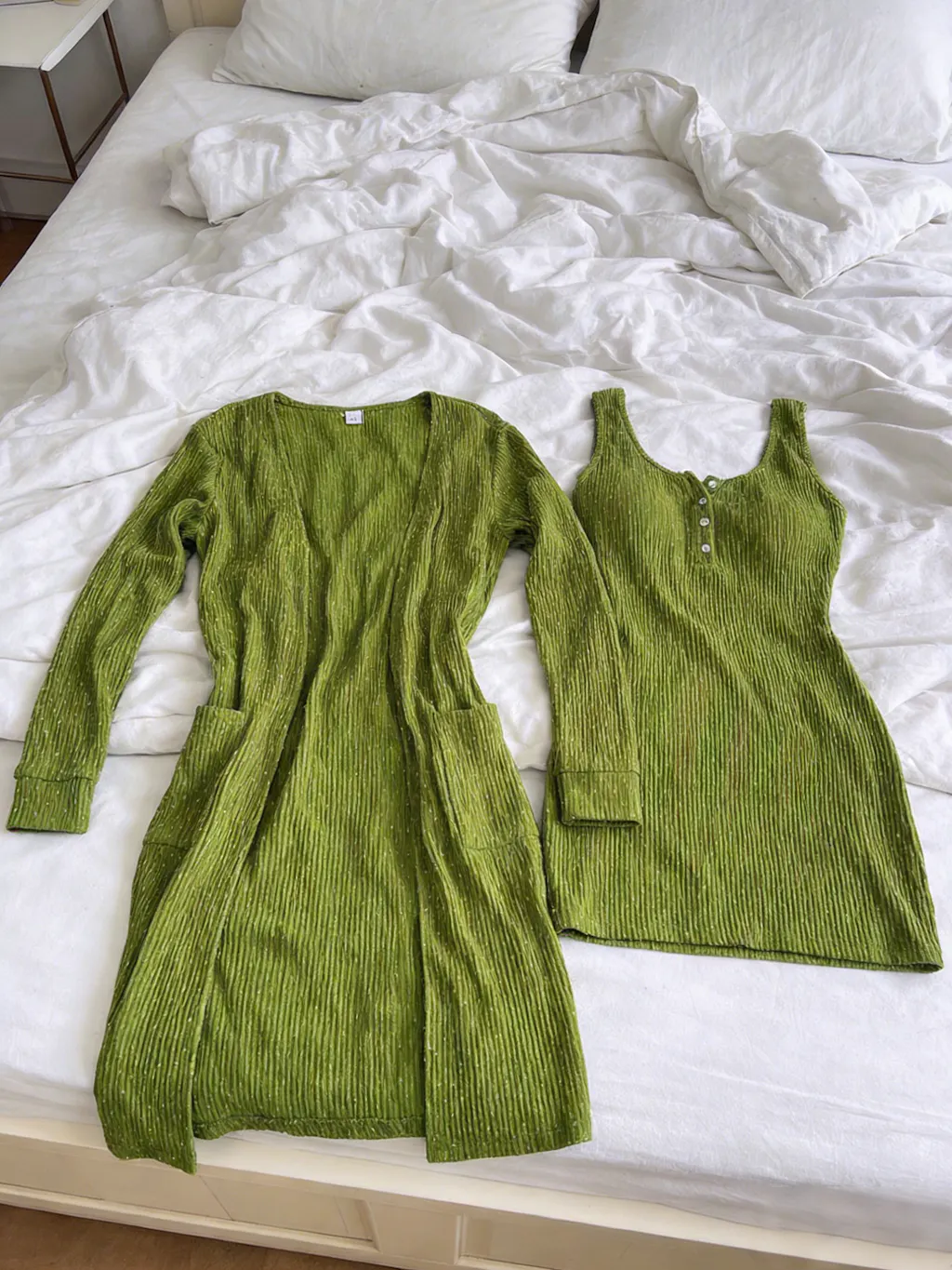 Silhouette & Fit: The slim-fit mini tank dress contours the waist and hips for a clean, body-skimming shape, while the mid-length cardigan features a relaxed straight cut that drapes past the hips. Together, they balance fitted and loose proportions for an easy layered silhouette.