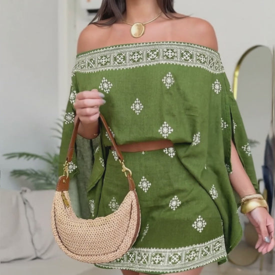 Design Details: Top allows single-shoulder, bandeau, or off-shoulder styling; tribal embroidery adds vintage charm; skorts include elastic waist for comfort, while slits enhance movement and casual boho elegance.