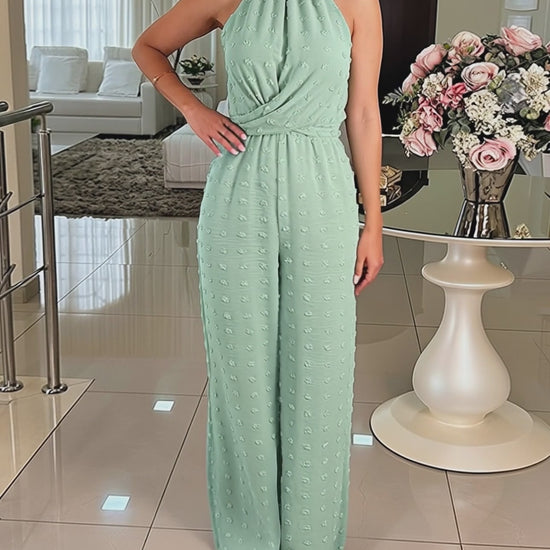 Love this textured jumpsuit! Allover 3D decor is unique, halter neck fits well. Hollow-out back, tie waist and wide legs—total casual chic!