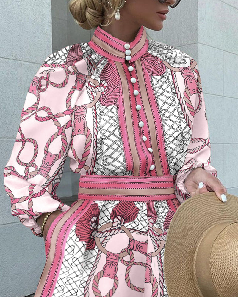Chain Print Stand Collar Lantern Sleeve Button Front Top and Casual Elastic Waist Shorts Set