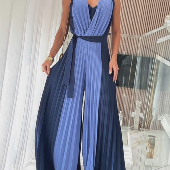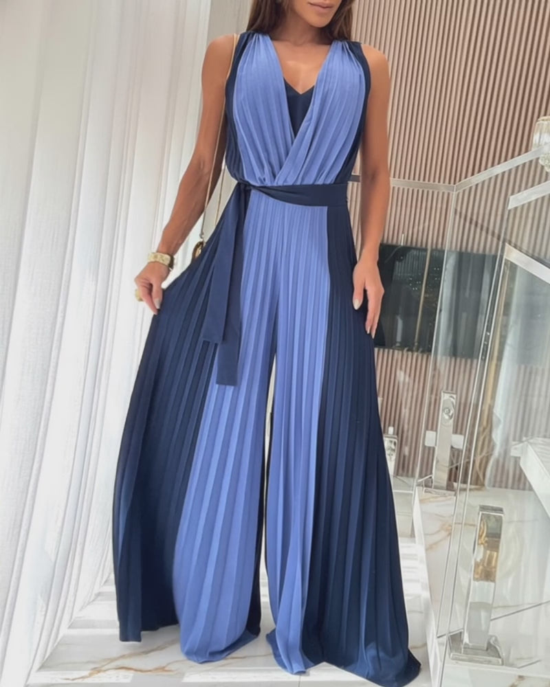 Colorblock Sleeveless Criss Cross Plunge V Neck Jumpsuit Casual Waist Tied Detail Pleated Romper