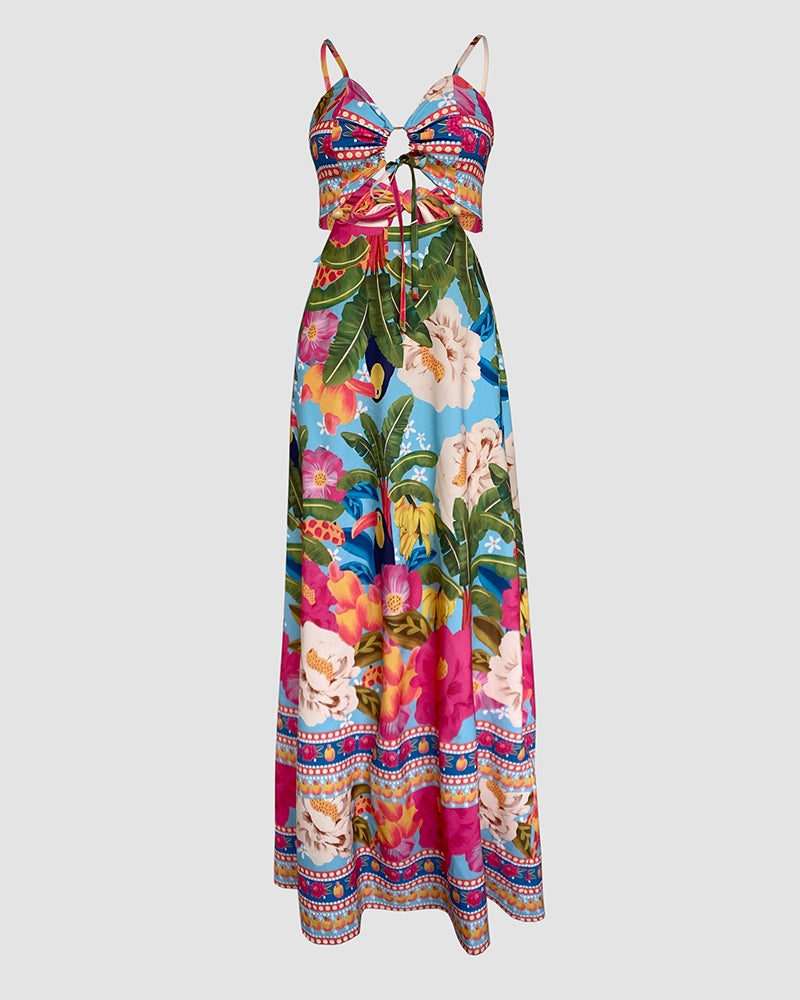 Floarl Print V Neck Lace Up Hollow Out Vaction Dress Casual A Line Tied Detail Backless Maxi Dress