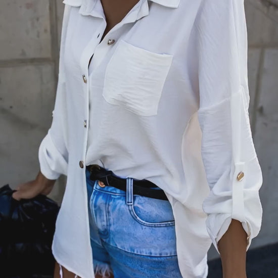 Metal Chain Decor Turn-down Collar Turn-Up Sleeves Front Button Shirt Casual Backless Asymmetrical Hem Top