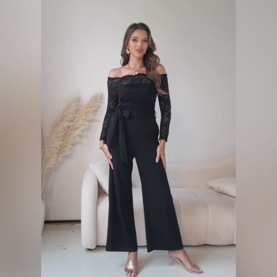 Off Shoulder Long Sleeve Eyelash Lace Spliced Slim Fit Overalls Casual Zipper Back Jumpsuit with Belt