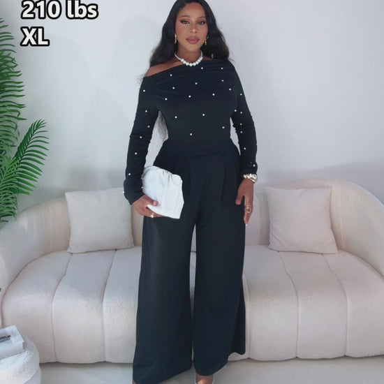 Silhouette & Fit: The skew-neckline highlights the collarbone and shoulder line, while the cinched high waist with wide-leg pants creates a flattering, elongated silhouette.