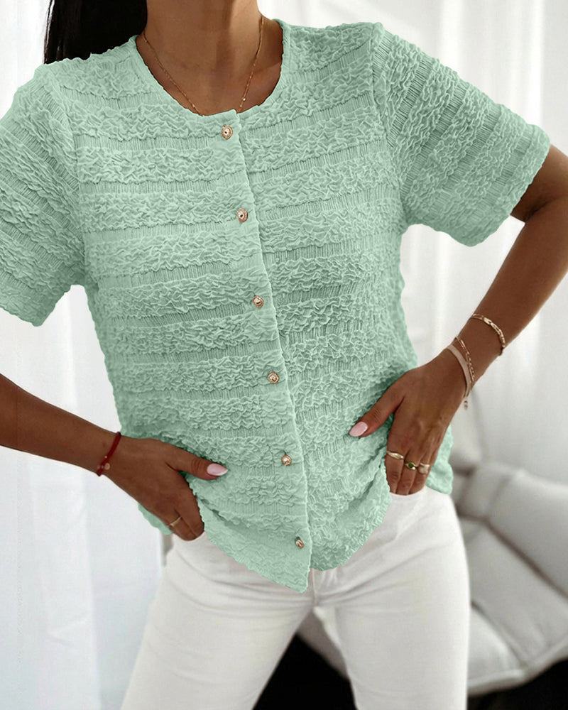 Round Neck Short Sleeve Pearls Button Front Textured Top