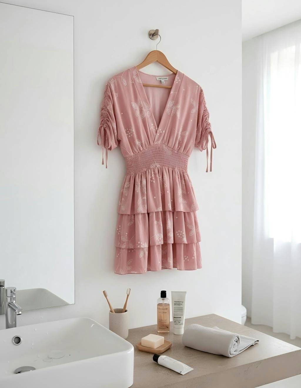 Silhouette & Fit: Overlap V-neck bodice pairs with a high shirred waist to define the waistline. The tiered ruffle hem creates a cake-style mini skirt that adds bounce and movement, balancing a fitted upper body with a playful flared finish.