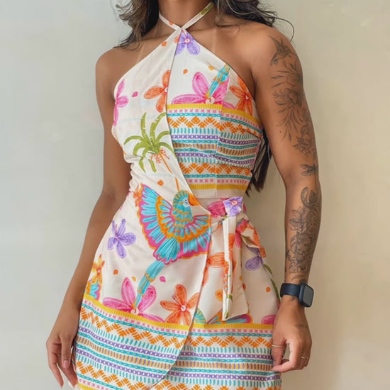 Design Details: Features a halter neckline to frame shoulders, backless tie-back design, and wrap-front skorts cut. Tropical mixed prints with palms, florals, birds, and geometric colorblocks add rich visual layering.