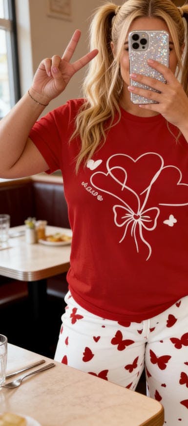 Design Details: The top and pants pairs with heart and butterfly print pants, while the elastic waistband and functional pockets combine practicality with playful, romantic style for a versatile loungewear set.
