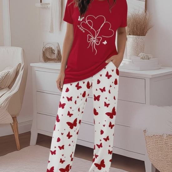 Valentine's Day 2 Pieces Outfit Round Neck Short Sleeve Top and Elastic Waist Pants Set Casual Heart & Butterfly Print Loose Fit Pajamas Set