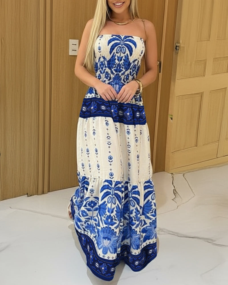 Vintage Floral & Plants Print Cinched Waist Shirred Strapless Dress Casual Ruffle Hem Vacation Dress