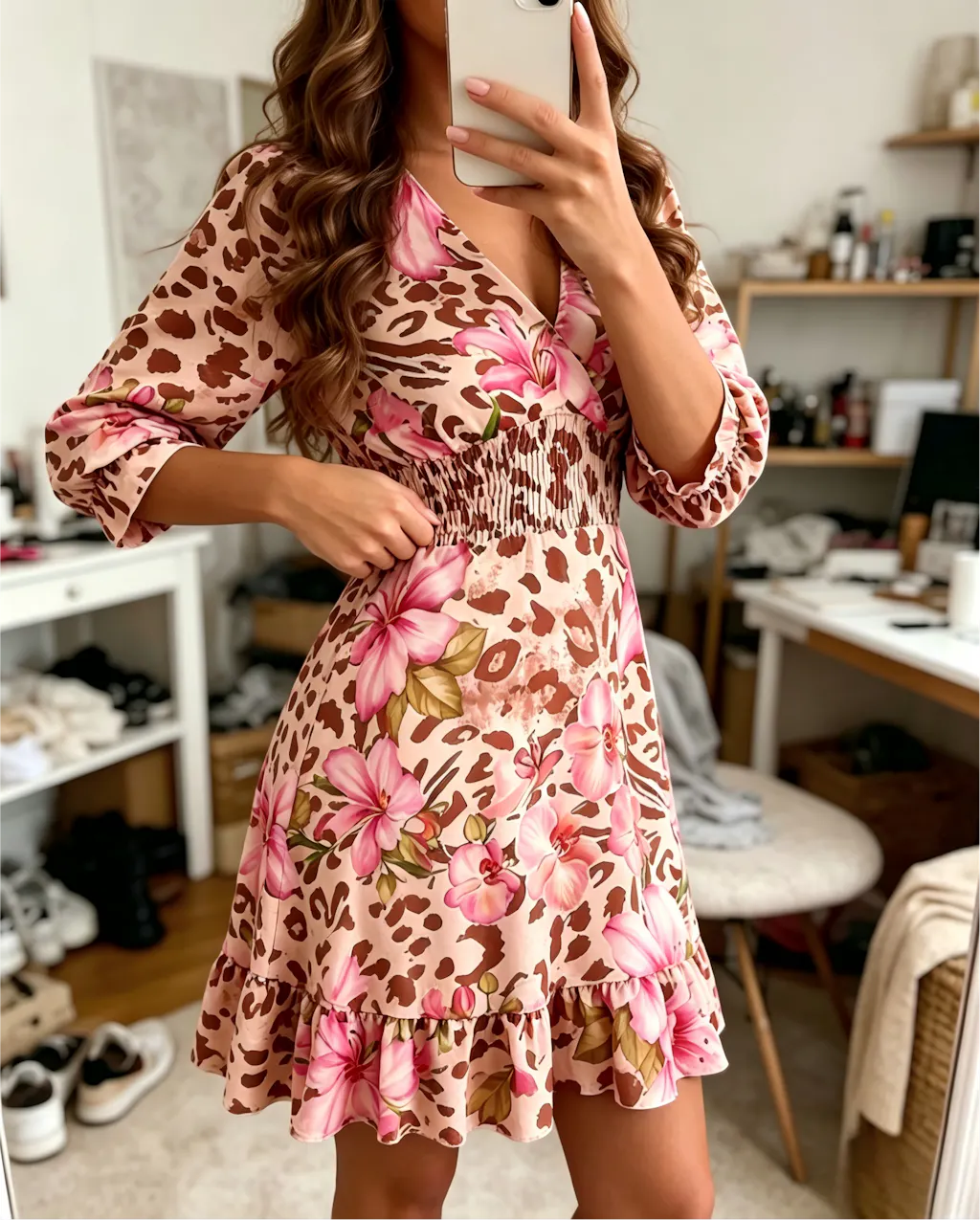 DESIGN - Leopard Floral Print & Ruffle Accents: Combines a classic leopard base with floral print layering for a mixed-pattern visual. Features ruffled sleeve cuffs and a ruffle hemline that add movement and layered texture, enhancing the overall structure without overwhelming the print.