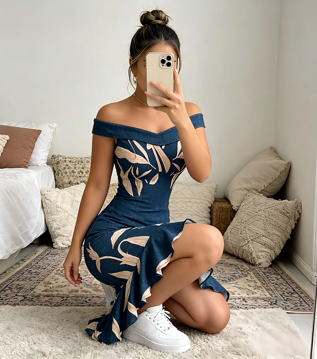 Women's Off Shoulder Midi Dress Leaf Print Bodycon Mermaid Dress Ruffle Hem Slit Party Cocktail Dress