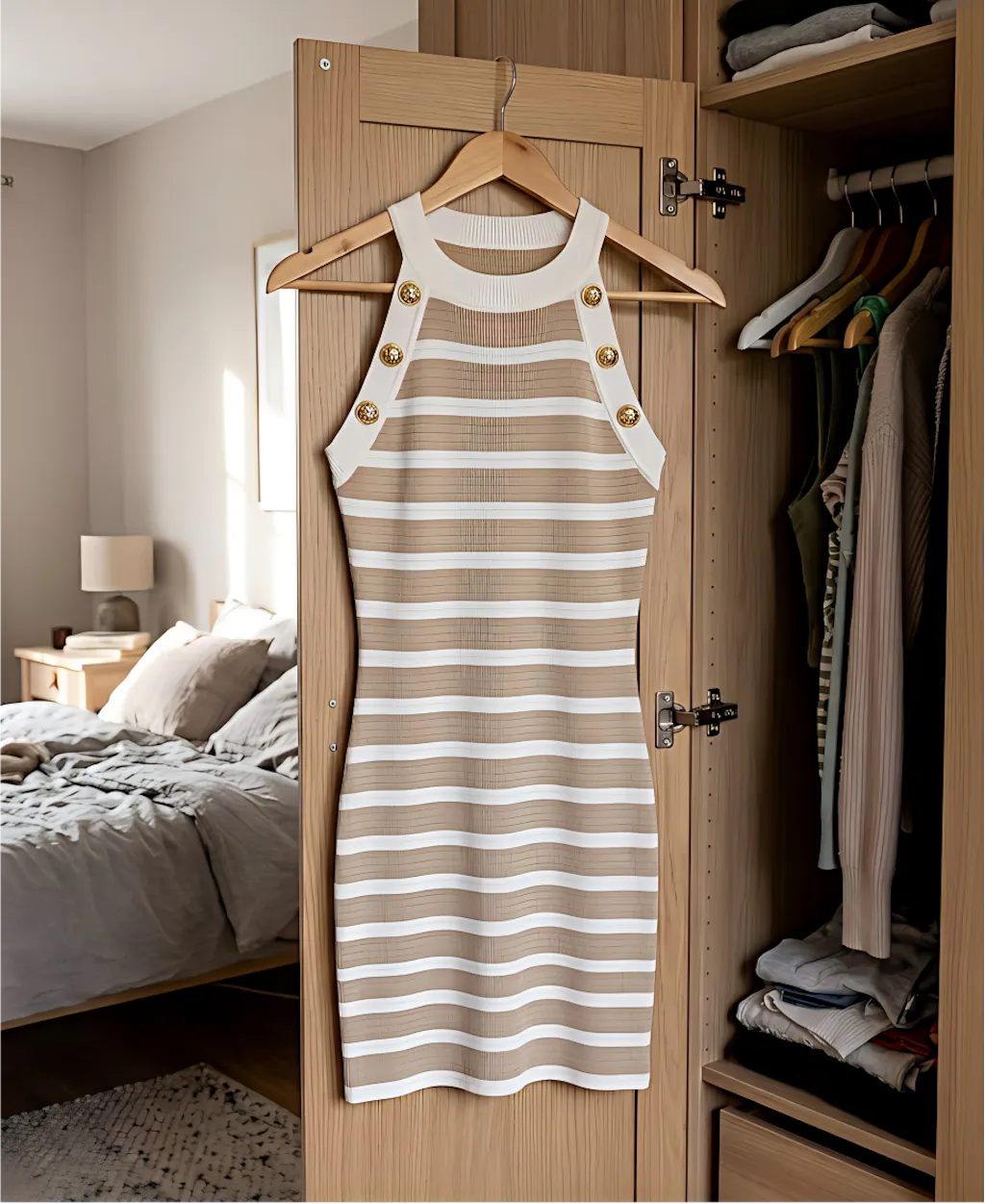 Women's Striped Halter Neck Knit Mini Dress Casual Golden Buttons Sleeveless Sundress