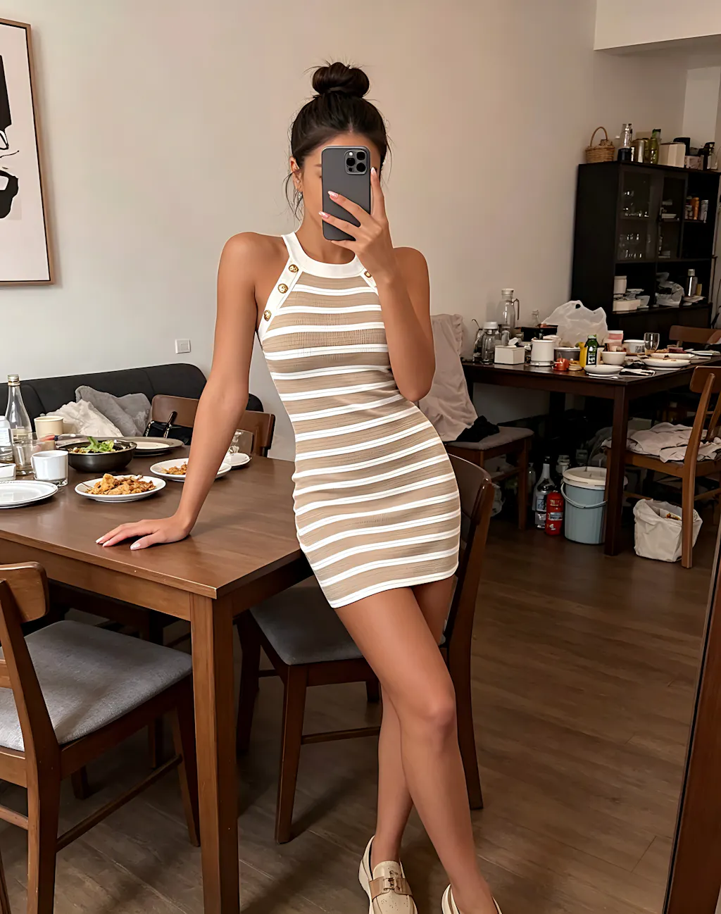 SILHOUETTE - Refined Contouring Frame: Features a sophisticated halter-neck profile and a precision-contoured bodycon cut. Engineered to follow body lines, the sleek vertical stretch visually elongates the neck and frame. The tailored mini-length offers a flattering, statuesque appearance for various silhouettes.
