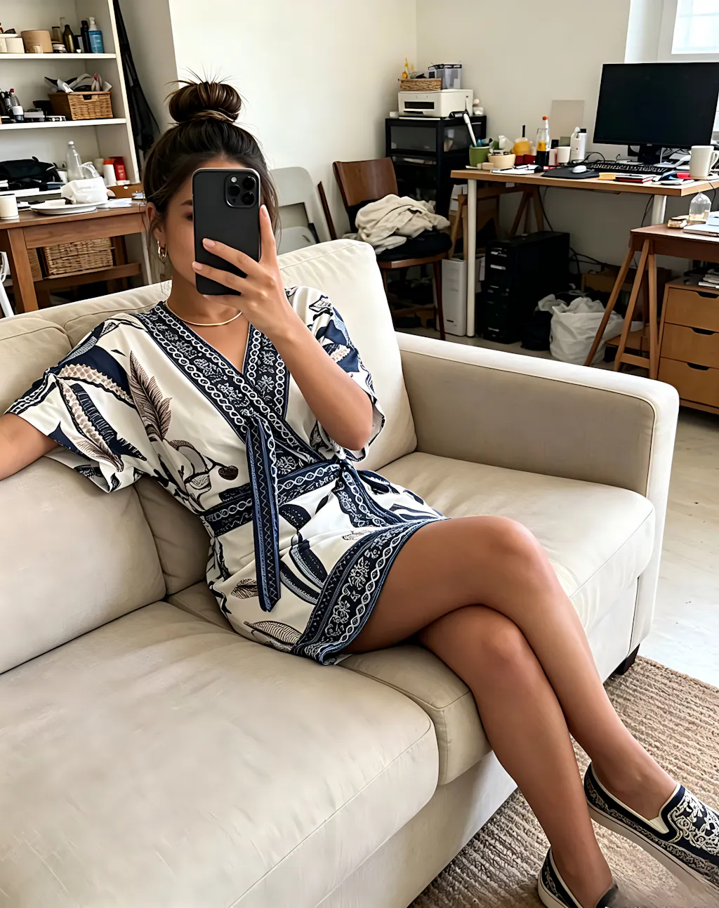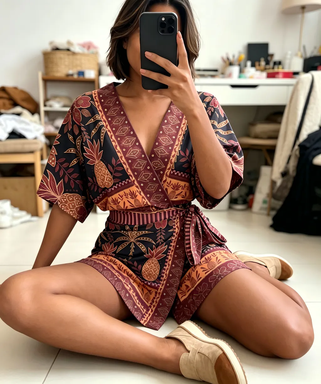 SILHOUETTE - Refined Contouring Frame: Features a sophisticated wrap-front V-neckline and a precision-contoured high-waist profile. Engineered with relaxed batwing sleeves and a wide-leg skort structure, this frame follows body lines for a liberated, airy fit. The statuesque A-line cut masterfully elongates the legs and offers a streamlined look for various body types.