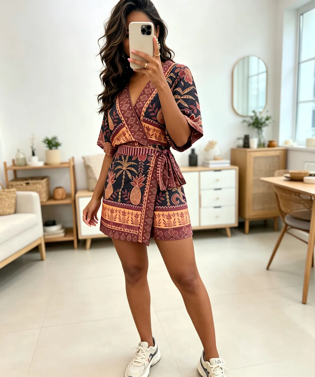 DESIGN - Botanical Artistry & Tied Details: Elevated by a high-impact narrative of vintage pineapple motifs and a strategic fake two-piece skirt-overlay. Meticulously engineered with an adjustable side-tie waist to allow for a personalized fit. This design balances modern "Resort-glam" aesthetics with intentional structural details for a secure, breezy, and photogenic profile.