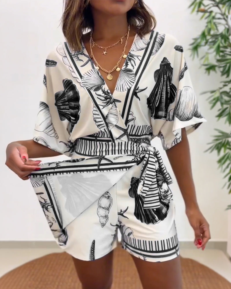 Starfish & Seashell Print Overlap V Neck Half Sleeve Wrap Knot Side Romper Casual Stretchy Back Waist Vacation Romper
