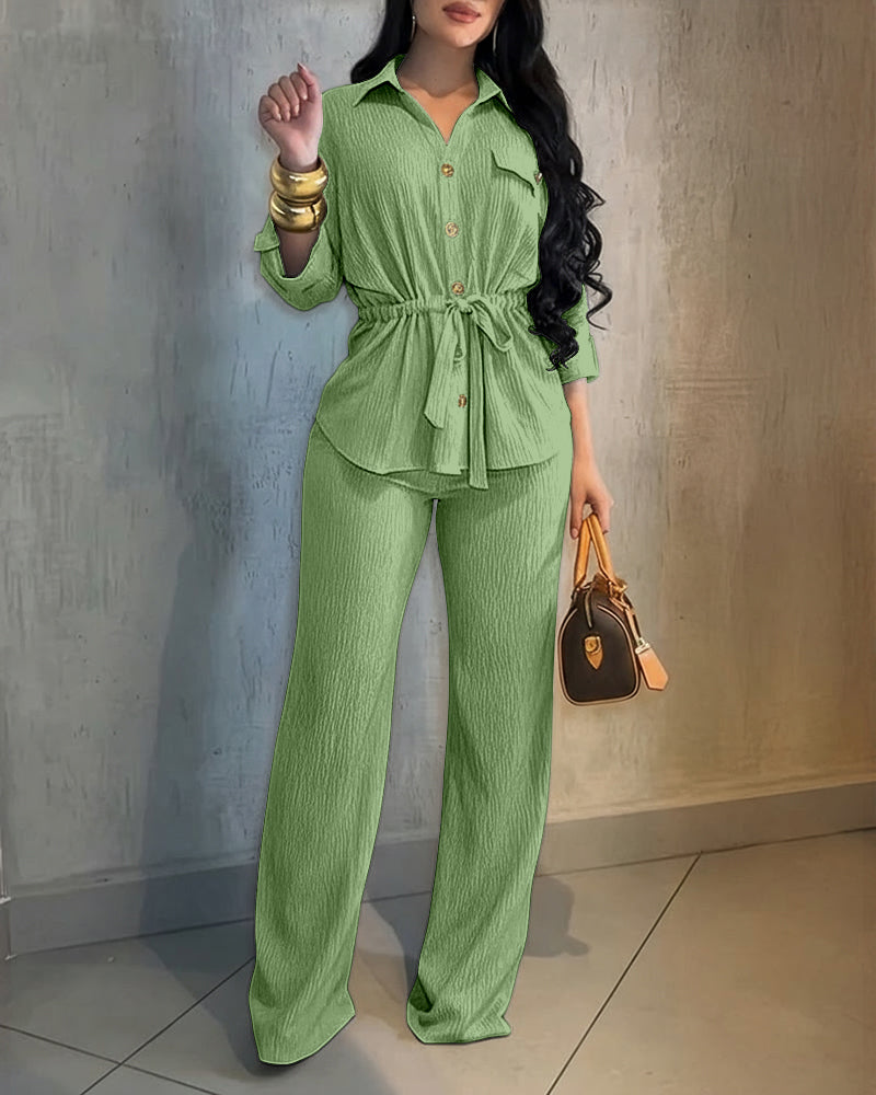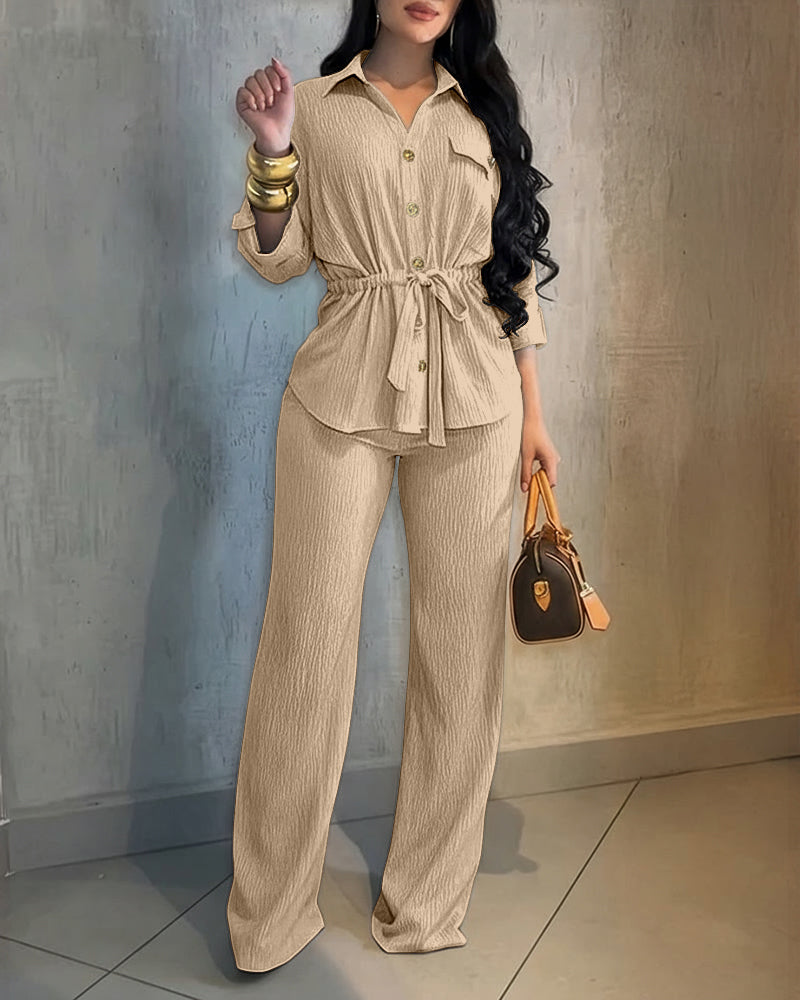 2 Pieces Outfit Vintage Turn-down Collar Roll Up Sleeve Button Front Flap Pocket Design Waist Drawstring Top and Elastic Waist Wide Leg Pants Set Casual Textured Commuting Set